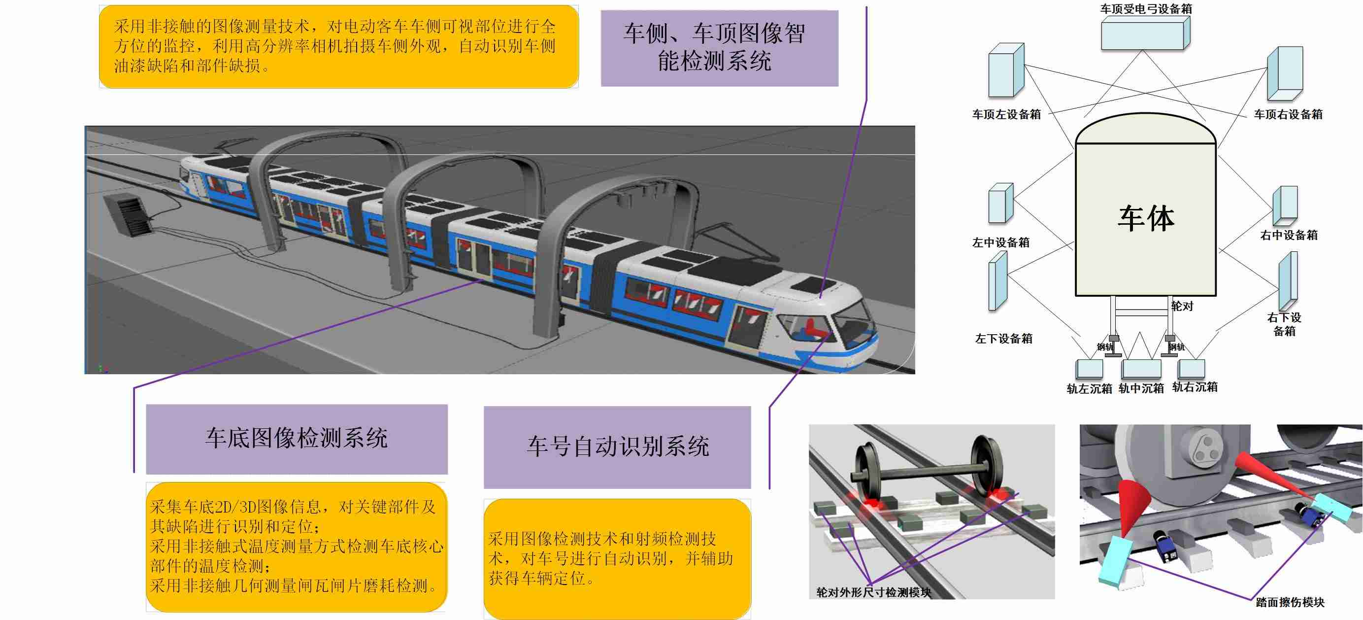 采用先进结构光辅助视觉检测技术,实现对轮缘几何参数、碳滑板、闸瓦、闸片的在线测量。